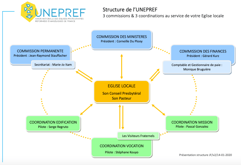 L’UNEPREF est structurée de la même manière qu’une grande association. On y retrouve une sorte de bureau (la commission permanente), un groupe qui gère les finances (la commission des finances), un groupe qui s’occupe du recrutement et du soin des pasteurs (commission des ministères), un groupe qui s’occupe de l’édification des Églises sur le plan national (la coordination édification), un groupe qui s’occupe de gérer la mission (coordination missionnaire) et un groupe qui cherche à susciter des vocations et à dynamiser la dynamique sectorielle (coordination vocation). En plus de cela, certains sont mandatés pour s’occuper de la jeunesse ou des affaires administratives et de comptabilité. Vous pouvez contacter les différentes personnes qui gèrent ces domaines pour collaborer avec elles (ici). Nous nous retrouvons chaque année dans une sorte de grande assemblée générale qui s’appelle un synode. Ces synodes sont ouverts à tous mais seuls les pasteurs en paroisse et les personnes choisies par les Églises peuvent y voter1. Des décisions y sont votées, qu’elles soient administratives ou théologiques, et nous sommes appelés à les respecter et à les vivre. Le conseil, en particulier, est le moteur qui doit expliquer les décisions du synode à l’Église et les faire respecter. Pour plus de détails sur le fonctionnement de l’UNEPREF, vous pouvez aller ici.