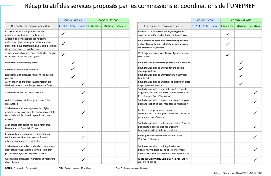 Il est important de souligner que l’engagement des Églises locales et de ses membres est fondamental. Ceux qui travaillent dans les commissions et coordinations de l’UNEPREF sont membres des ERE. Les Églises locales sont donc appelées à proposer certaines personnes qui sont susceptibles d’aider dans les différentes coordinations, commissions et engagements de l’union (en particulier la jeunesse). Sans ces personnes, l’UNEPREF ne pourrait pas fonctionner ni vivre. En même temps, l’implication de l’UNEPREF dans la vie des Églises locales est indéniable et reste très importante est utile. Le tableau ci-dessous explique les différents services que l’UNEPREF propose en fonction des différentes coordinations et commissions: